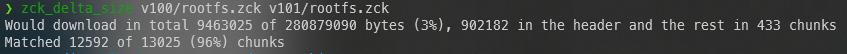 이 접근 방식의 큰 장점 중 하나는 metadata와 압축 chunk가 여전히 단일 파일에 바인딩되어 빌드 시스템에서 빌드하고 익숙한 방식으로 전달할 수 있다는 것입니다. 업데이터는 먼저 metadata, 즉 zchunk 파일의 헤더가 필요하며, 이를 처리하여 다운로드해야 할 chunk를 감지합니다. 각 chunk에는 고유한 hash가 있으며, 장치에서 이미 사용 가능한 chunk가 손상되지 않았는지 확인하기 위해 hash와 비교하여 확인합니다.
