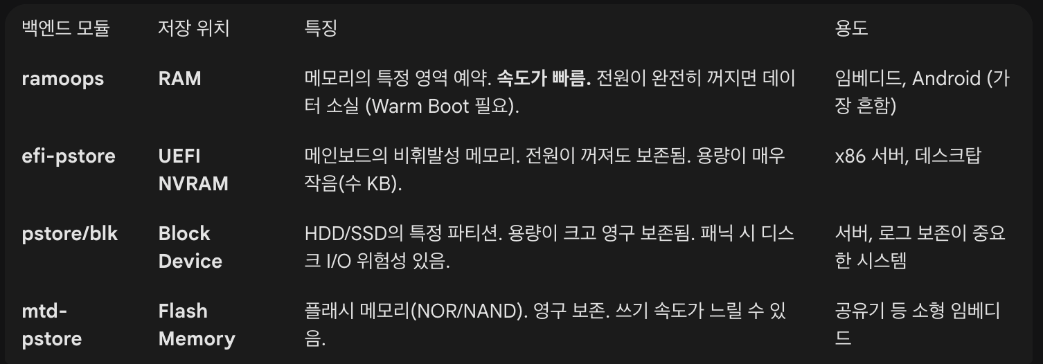 - 크래시 발생: 커널 패닉 발생 -> pstore가 백엔드(예: RAM)에 로그 기록 -> 재부팅.