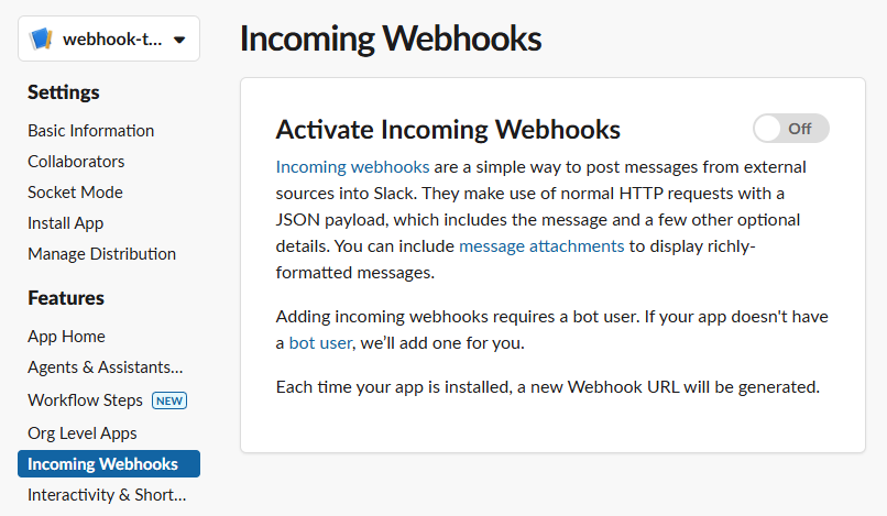 왼쪽 목록의 Features 에서 Incoming Webhooks 선택. On으로 설정 변경.