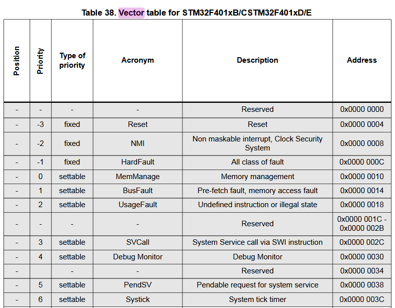 - Cortex-M0는 기능이 줄어들며 벡터 테이블 엔트리 수도 감소
