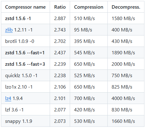 zstd는 CPU 성능을 효율적으로 사용하여 빠른 압축 및 해제 속도를 제공한다. 특히, 낮은 압축 레벨에서는 매우 빠르게 작동하며, 높은 압축 레벨에서는 상대적으로 더 높은 압축률을 제공한다.- -1부터 22까지의 다양한 압축 레벨을 지원한다. 기본 값은 3이며, 이 값은 대부분의 경우 적절한 성능과 압축률을 제공한다. 낮은 숫자는 더 빠르지만 압축률이 낮고, 높은 숫자는 느리지만 압축률이 더 높다.