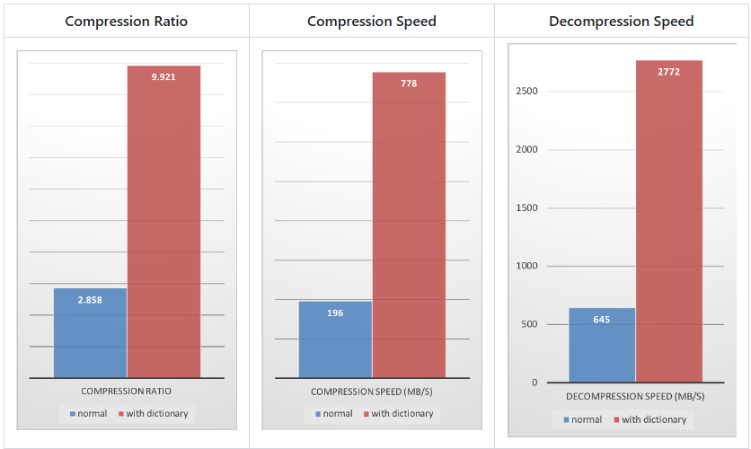 이러한 상황을 해결하기 위해 zstd는 선택한 데이터 유형에 맞게 알고리즘을 조정하는 데 사용할 수 있는 training mode 를 제공한다. 몇 개의 샘플(샘플당 하나의 파일)을 제공하면 Zstandard를 훈련시킬 수 있다. 이 훈련의 결과는 압축 및 압축 해제 전에 로드해야 하는 "dictionary"라는 파일에 저장된다. 이 dictionary를 사용하면 작은 데이터에서 달성할 수 있는 압축률이 크게 향상된다.