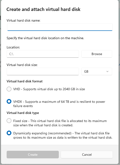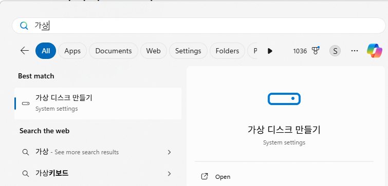 윈도우 시작 버튼에서 "가상 디스크 만들기" 선택